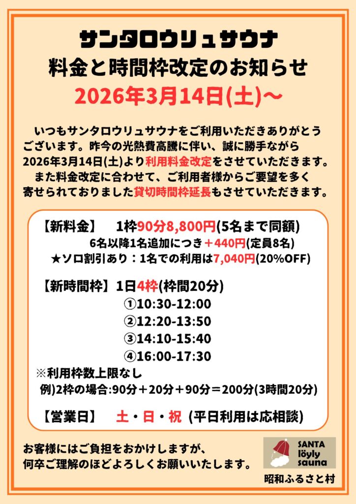 貸切サウナの料金改定と時間枠変更のお知らせ